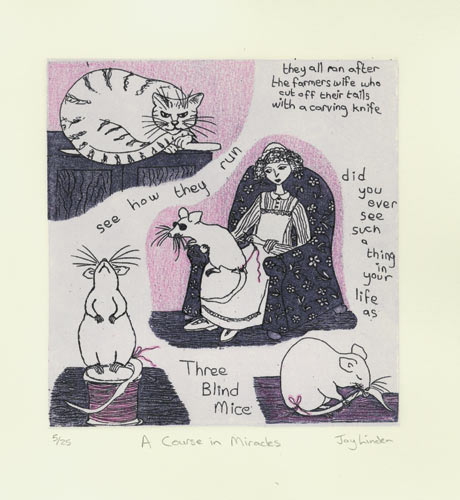 Title: A Course in Miracles Medium: Etching with aquatint, coloured pencil and monoprint Edition 25 Image size: 150 mm x 150 mm Paper: Hahnemuhle Etching, natural white, 300gsm Paper size: 280mm x 250mm Price: NZ$250